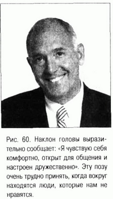 Признаки подлинного, непритворного счастья всегда проявляются на лице и шее. Позитивные эмоции выражаются в разглаживании морщин лба, расслаблении мышц вокруг рта, появлении полных губ (человек перестает их сжимать) и расширении глаз по мере расслабления окружающих мышц. Когда мы чувствуем себя действительно комфортно, то мышцы лица расслабляются и голова склоняется в сторону, раскрывая самую уязвимую часть тела, сьо (см. рис. 60). Эту позу полного комфорта, которую часто можно наблюдать во время ухаживания, почти невозможно подделать, когда мы ощущаем неудовольствие, напряжение, подозрение или угрозу.