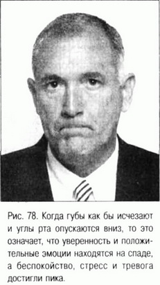 На следующей серии фотографий (см. рис. 75—78) я показываю, как губы постепенно из полных (знак «все в порядке») превращаются в поджатые или как бы вовсе исчезают (знак «дела плохи»). Обратите особое внимание на то, как на последнем снимке (рис. 78) углы губ опускаются вниз, придавая рту форму перевернутой буквы U, что свидетельствует о сильном дистрессе (дискомфорте). Это знаковый мимический жест или сигнал того, что человек испытывает стресс.
