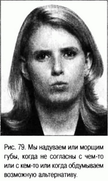 Всегда внимательно следите за людьми, которые надувают губы, когда вы или кто-то другой что-то говорят (см. рис. 79). Такое поведение обычно означает, что они не согласны со сказанным, обдумывают какую-то альтернативную мысль или идею. Эта информация может оказаться очень ценной и поможет вам определить, как лучше изложить суть дела, изменить ваше предложение или направить разговор. Если вы хотите убедиться, что означают надутые губы (например, несогласие или обдумывание альтернативной точки зрения), то нужно будет внимательно следить за беседой достаточно долго, чтобы собрать дополнительные факты.