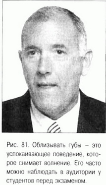 Когда человек выполняет другие знаковые движения рта, которые ассоциируются со стрессом, например кусает губы, дотрагивается до рта, облизывается или грызет ногти, то это укрепляет уверенность наблюдателя в том, что человек чего-то опасается (см. рис. 81). Такими же признаками опасений являются прикосновения к губам и/или их облизывание во время обдумывания вариантов, особенно если это продолжается слишком долго.