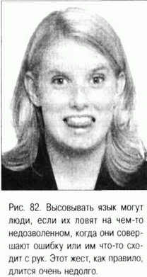 Высовывать язык — это жест, к которому прибегают люди, когда им удается выйти сухими из воды или когда их хватают за руку. Мне приходилось наблюдать такое поведение на блошиных рыках в Америке и России, среди уличных торговцев в Южном Манхэттене и за покерными столами в Лас-Вегасе, на допросах в ФБР и во время деловых встреч. Во всех случаях люди использовали это движение — высовывали язык между зубами, не касаясь губ, — как знак завершения какой-либо сделки или в качестве заключительного невербального заявления (см. рис. 82). В каком-