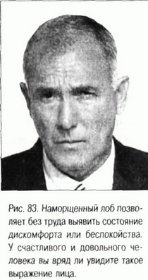 Обычно люди морщат лоб (и хмурят брови) в моменты тревоги, печали, забот, замешательства или гнева (см. рис. 83), Чтобы определить подлинное значение этого сигнала, его всегда следует рассматривать в контексте. Например, на днях я наблюдал за тем, как кассирша в супермаркете морщила лоб, когда в конце смены подсчитывала выручку. Нужно было видеть, с каким напряжением и сосредоточенностью на лице она подбивала итог. Такое же выражение лица можно увидеть у человека, которого только что арестовали и ведут через толпу репортеров. Когда человек лишен возможности защищаться и не может спастись бегством, кожа на его лбу обычно собирается в складки. Вот почему так часто на фотографиях, которые хранятся в полицейских архивах, у арестованных наморщены лбы.