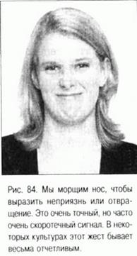 На днях ко мне обратилась женщина, торговый агент, которая представляла одну крупную сеть спортивно-оздоровительных центров в Центральной Флориде. Молодая женщина увлеченно уговаривала меня записаться в местный центр, обещая, что это будет стоить мне всего один доллар в день до конца моей жизни. Глядя на то, как внимательно я ее слушал, она, наверное, посчитала меня перспективным клиентом и стала расхваливать свой центр с удвоенной энергией. Я терпеливо дождался возможности вставить слово и спросил, есть ли там бассейн. Она ответила, что нет, но зато есть много других превосходных тренажеров. Тогда я сказал, что на данный момент плачу за посещение спортивного центра двадцать два доллара в месяц, и что там есть бассейн олимпийского размера. Когда я об этом говорил, то заметил ее направленный в землю взгляд и микрожест отвращения (ее нос слегка наморщился, а левая сторона рта чуть приподнялась кверху) (см. рис. 84). Жест был очень мимолетным, и если бы продлился чуть дольше, то стал бы похож на выражение досады. Этого микрожеста мне хватило, чтобы понять, как сильно ей не понравились мои слова. Через пару секунд она с извинением попрощалась со мной, чтобы обратиться со своим предложением к кому-то другому.