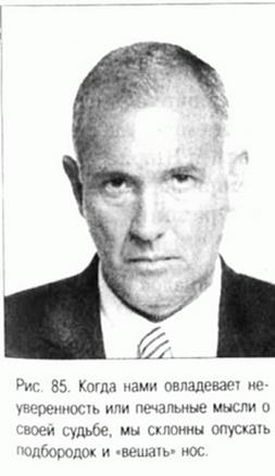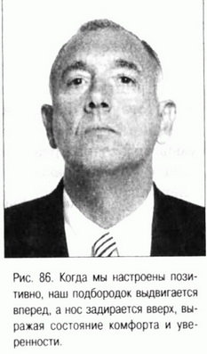 Старая американская поговорка «Держи подбородок выше» — это замечание, адресованное тем, кто переживает черную полосу неудач и невзгод (см. рис. 85 и 86). Эта народная мудрость передает суть нашей лимбической реакции на жизненные неприятности. Опущенный подбородок воспринимается как признак неуверенности и негативных эмоций, в то время как человек, который поднимает подбородок вверх, выглядит позитивно настроенным молодцом.