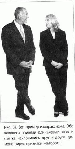 Когда людям комфортно, в их невербальном поведении должна присутствовать согласованность. Ритм дыхания двух человек, которым приятно находиться рядом, становится синхронным. То же самое происходит с интонациями речи, высотой голоса и манерой поведения в целом. Представьте, например, пару влюбленных за столиком в уютном кафе. Стоит одному из них наклониться вперед, как то же самое делает другой. В науке такое копирование движений носит название изопраксизм. Если человек, который беседует с нами стоя, засунет руки в карманы и скрестит ноги, то мы, скорее всего, сделаем то же самое (см. рис. 87). Копируя поведение другого человека, мы как бы подсознательно говорим: «Мне комфортно в твоем присутствии».
