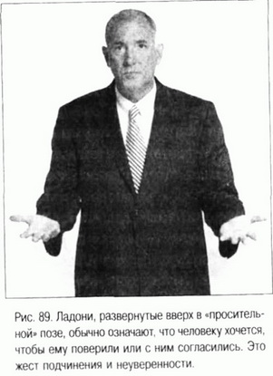 Поза, при которой человек разводит и выставляет перед собой руки ладонями вверх, называется «просительной» (или «молитвенной») (см. рис. 89). Верующие обращают ладони к Богу, чтобы попросить милости. Похожим образом ведут себя солдаты, которые поднимают руки и держат их ладонями вверх, когда сдаются в плен. Такое же поведение можно наблюдать у людей, которым очень хочется, чтобы вы им поверили. Когда в разговорах с вами люди будут делать декларативные заявления, обращайте внимание на то, как они держат руки: ладонями вверх или вниз. В ходе будничных обсуждений, когда никто не намерен яростно отстаивать свою точку зрения, ладони собеседников могут быть повернуты в любую сторону.