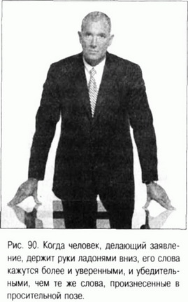 Однако когда человек делает страстное и утвердительное заявление, вроде «Вы должны мне поверить, я ее не убивал», то кисти его рук должны быть повернуты ладонями вниз (см. рис. 90). Если в этот момент ладони смотрят вверх, словно человек умоляет, чтобы ему поверили, то лично я нахожу такое заявление подозрительным. Не претендуя на истину в конечной инстанции, я все же склонен ставить под сомнение любые декларативные заявления, авторы которых держат руки ладонями вверх. Повернутые вверх ладони не являются знаком утверждения, а означают просьбу поверить. Тем, кто говорит правду, не нужно умолять, чтобы им поверили. Они просто делают заявление и на том стоят.
