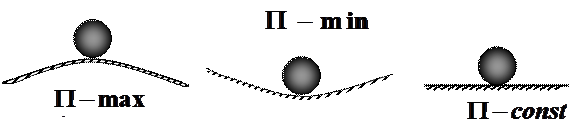 В состоянии устойчивого равновесия потенциальная энергия тела минимальна. В состоянии неустойчивого равновесия потенциальная энергия тела максимальна. Если при смещении тела от положения равновесия его потенциальная энергия не изменяется, то равновесие будет безразличным.