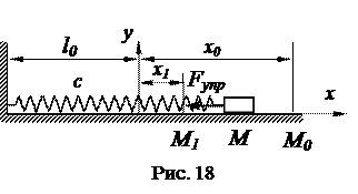 Определим работу силы упругости на перемещении груза М из положения М0 в положение М1 (рис. 18). Силу упругости считаем пропорциональной деформации упругого элемента с жесткостью с, (Н/м). В этом случае силу упругости можно найти по формуле: Fупр= сx, где x – деформация упругого элемента в рассматриваемом положении, которая равна координате х груза М.