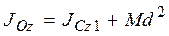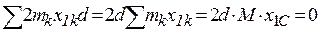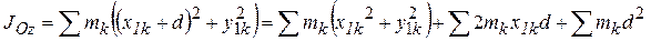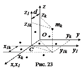 Выберем ось Ox так, что бы она проходила через центр масс системы (т. С). Пусть расстояние между осями z и z ОС = d. Свяжем с т. С новую систему координат Сx1y1z1. Очевидно, что координаты точек в системах Oxyz и Сx1y1z1 связаны между собой соотношениями
