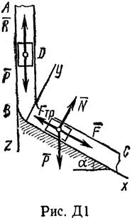Пример Д1. На вертикальном участке АВ трубы (рис. Д1) на груз D массой m действует сила тяжести и сила сопротивления