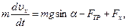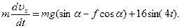 где FТР=fN. Для определения N составим уравнение в проекции на ось Вy. Так как ау=0, получим 0=N-mgcosα, откуда N=mgcosα. Следовательно, Fтр=fmgcosα; кроме того, Fx=16sin(4t) и управление (8) примет вид