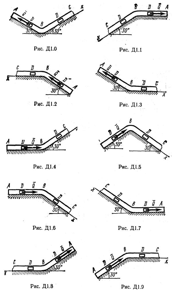 Груз D массой m, получив в точке А начальную скорость υ0, движется в изогнутой трубе ABC, расположенной в вертикальной плоскости; участки трубы или оба наклонные, или один горизонтальный, а другой наклонный (рис. Д1.0 – Д1.9, табл. Д1). На участке АВ, на груз кроме силы тяжести, действуют постоянная сила