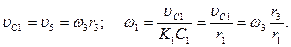 Все входящие сюда скорости надо выразить через искомую ω3. Для этого предварительно заметим, что υС1=υ5=υА, где А – любая точка обода радиуса r3 и что точка К1 – мгновенный центр скоростей катка 1, радиус которого обозначим r1. Тогда