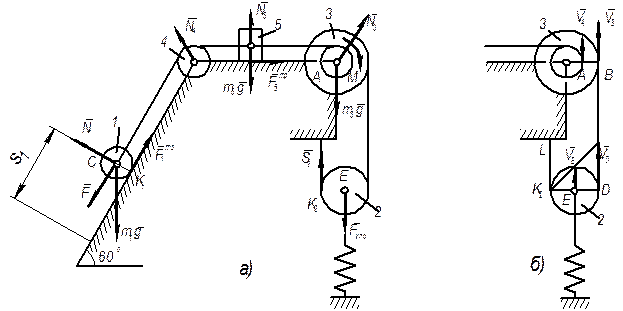 Пример Д4. Механическая система (рис. Д4, а) состоит из сплошного однородного цилиндрического катка 1, подвижного блока 2, ступенчатого шкива 3 с радиусами ступеней R3 и r3 и радиусом инерции относительно оси вращения ρ3, блока 4 и груза 5(коэффициент трения груза о плоскость равен f). Тела системы соединены нитями, намотанными на шкив 3. К центру Е блока 2 прикреплена пружина с коэффициентом жесткости с; ее начальная деформация равна нулю. Система приходит в движение из состояния покоя под действием силы F=f(s), зависящей от перемещения s точки ее приложения. На шкив 3 при движении действует постоянный момент М сил сопротивления.