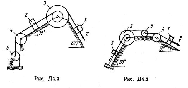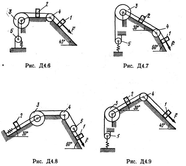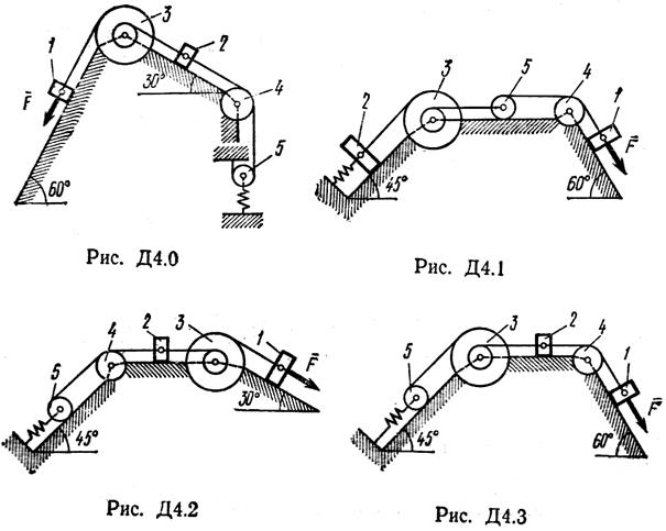 Указания. Задача Д4 – на применение теоремы об изменении кинетической энергии системы. При решении задачи учесть, что кинетическая энергия Т системы равна сумме кинетических энергий всех входящих в систему тел; эту энергию нужно выразить через ту скорость (линейную или угловую), которую в задаче надо определить. При вычислении Т для установления зависимости между скоростями точек тела, движущегося плоскопараллельно, или между его угловой скоростью и скоростью центра масс воспользоваться мгновенным центром скоростей (кинематика). При вычислении работы надо все перемещения выразить через заданное перемещение s1, учтя, что зависимость между перемещениями здесь будет такой же, как между соответствующими скоростями.