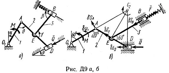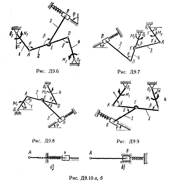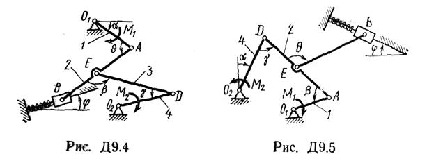 Указания. Задача Д9 — на определение условий равновесия механической системы с помощью принципа возможных перемещений. Механизм в рассматриваемой задаче имеет одну степень свободы, т. е. одно независимое возможное перемещение. Для решения задачи нужно сообщить механизму возможное перемещение, вычислить сумму элементарных работ всех действующих активных сил и пар на этом перемещении и приравнять ее к нулю. Все вошедшие в составленное уравнение возможные перемещения следует выразить через какое-нибудь одно.