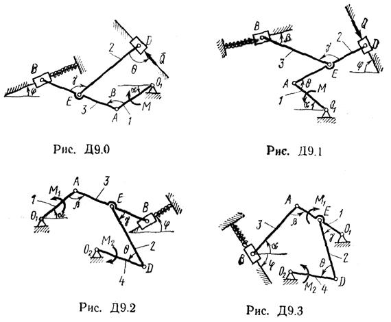 , а на кривошип 01А — пара сил с моментом М; на рис. Д9.2—Д9.9 на кривошипы 01А и 02D действуют пары сил с моментами М1 и М2.