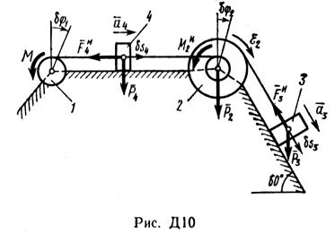 Указания. Задача Д10 – на применение (к изучению движения системы) общего уравнения динамики (принципа Даламбера – Лагранжа). Ход решения задачи такой же, как в задаче Д9, только предварительно надо присоединить к действующим на систему силам соответствующие силы инерции. Учесть при этом, что для однородного тела, вращающегося вокруг своей оси симметрии (шкива), система сил инерции приводится к паре с моментом М и = Jzε, где Jz – момент инерции тела относительно оси вращения, ε – угловое ускорение тела; направление М и противоположно направлению ε.