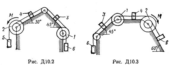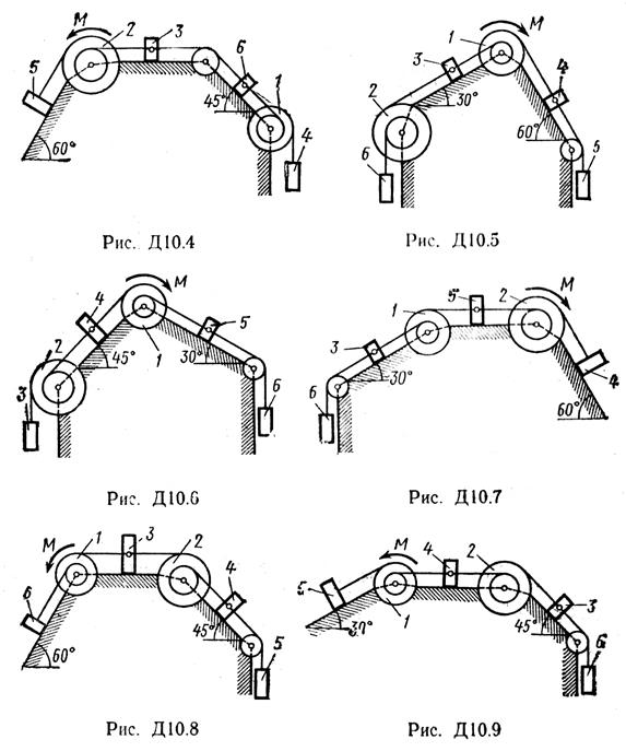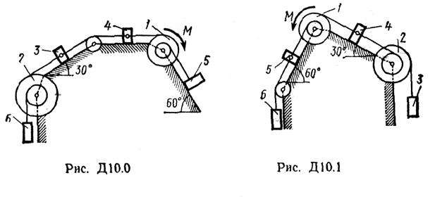 Механическая система состоит из однородных ступенчатых шкивов 1 и 2, обмотанных нитями, грузов 3—6, прикрепленных к этим нитям, и невесомого блока (рис. Д10.0—Д10.9, табл. Д10). Система движется в вертикальной плоскости под действием сил тяжести и пары сил с моментом М, приложенной к одному из шкивов. Радиусы ступеней шкива 1 равны: