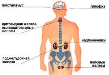 Эндокринными органами являются гипоталамус, щитовидная железа, поджелудочная железа, гипофиз, надпочечники, половые железы.