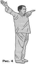 Затем встаньте прямо, опустите руки через стороны (рис. 4), одновременно сделав плавный выдох ртом. Представьте себе нисходящий поток ци от головы вдоль тела, струящийся как водопад к кончикам пальцев рук и ног. Почувствуйте приятное, трепетное ощущение, как будто поток струится внутри вашего тела. Представьте, что поток внутренней энергии уносит все лишнее из вашего тела: отрицательные эмоции, болезни, шлаки и т. п. Грязь покидает вас и уходит в землю через ступни. Одновременно наполните жизненной энергией каждую клетку своего тела, представляя себя здоровым и молодым. Не двигайтесь одну-две секунды, чтобы насладиться приятным ощущением разливающейся внутри энергии. Упражнение закончено. Повторите его десять — двадцать раз.