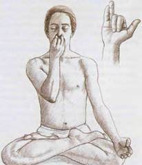 Ноздри зажимаем не меняя руки. Вторая рука лежит на колени (если вы находитесь в позе лотоса или полулотоса).