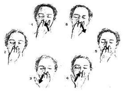 4.Зажимаем одну из ноздрей (для примера начнем с левой). Правая ноздря зажимается большим пальцем. Делаем вдох левой ноздрей. Задерживаем дыхание и зажимаем левую ноздрю безымянным пальцем и мизинецем.