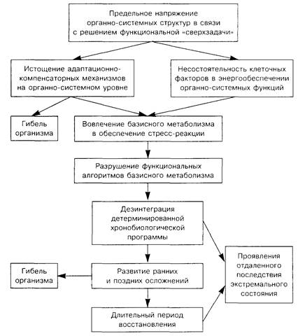 Рис. 1.1. Схема экстремального состояния организма и последовательного развития нарушении, обусловленных этим состоянием.