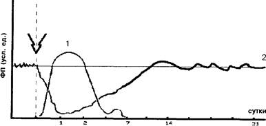 Рис. 2.2. Схема переориентации основного функционального потенциала организма после тяжелой сочетанной травмы вначале — на механизмы срочной адаптации (I—2-е сутки) (кривая I), затем — на формирование и развитие механизмов устойчивой долговременной адаптации (3—21-е сутки при неосложненном течении) (кривая 2).