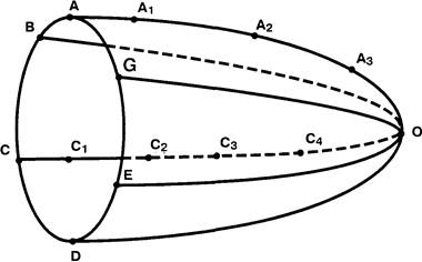 А, В, С, D, Е, G — условные траектории отдельных функциональных алгоритмов. А,—А,. С, — С. — звенья отдельных процессов, формирующих алгоритм. О — точка единения траекторий (целевое предназначение аттрактора).