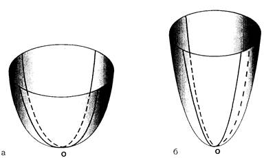 а — неглубокая (ме./кая) яма; образование флуктуации приводит к “расплескиванию” и нарушению аттрактора; б — глубокая яма: эффект расплескивания “гасится” притягивающей: силой це.ш (на примере гравитации). О — точка единения траектории.