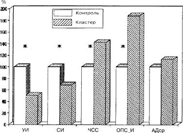 Рис. 4.5. Сравнительная оценка гемодинамических показателей в контрольной группе (100 %) и соответствующих показателей второго кластера. * — достоверные различия (р<0.05).