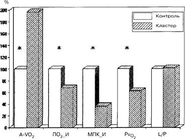 Рис. 4.6. Сопоставление некоторых показателен кислородного бюджета в контрольной группе (100 %) с соответствующими показателями второго кластера. * — достоверные различия (р<0.05).