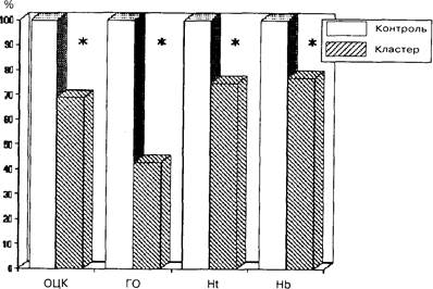 Рис. 4.7. Структура показателей ОЦК в контрольной группе (100 %) и во втором кластере. * — достоверные различия (р<0.05).