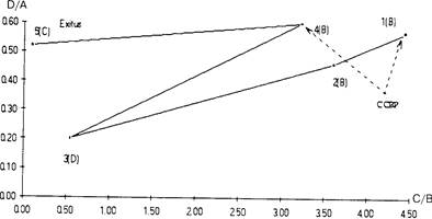 Проведенная интенсивная терапия привела к соответствующим результатам. Прежде всего стабилизировалась гемодинамика — снизилась тахикардия, артериальное давление не опускалось ниже 110 мм рт.ст. (имеется в виду систолическое). Несмотря на сохраняющуюся все еще низкую разовую производительность сердца (хотя она и возросла с 14. & до 23.5 г/м2). минутная достигла нормальных значений. В то же время прогрессирует анемия — количество эритроцитов уменьшилось до 2.24-Ю12 к/л. гемоглобин снизился до 74 г/л. гематокрит — до 0.21 л/л. Время, прошедшее после травмы. интенсивная терапия и развивающиеся компенсаторные процессы привели к уменьшению выраженности стрессовых явлений, что прежде всего отразилось в повышении и относительного (21 %) и абсолютного (1.134- 10'' к/л) количества лимфоцитов, в снижении сегментарно-лимфоцитарного индекса до 3.19. Лейкоцитарный индекс интоксикации снизился до 3. Количество палочкоядерных лейкоцитов уменьшилось до 89г. Максимальная температура тела не превысила 37.5 С. Проводимая искусственная вентиляция в режиме умеренной гипервентиляции обеспечивала парциальное давление кислорода в артериальной крови на уровне 111 мм рт.ст уровень парциального давления углекислого газа в артериальной крови был 28 мм рт.ст. Повысилась экстракция кислорода тканями — снизился уровень парциального давления кислорода в венозной крови до 31.6 мм рт.ст увеличился артерио-венозный градиент кислорода до 2.88 об %. При этом исследование патофизиологического профиля этой пострадавшей в системе функционального компьютерного мониторинга позволило выявить снижение отношения С/В. что свидетельствует о существующей тенденции к восстановлению аэробных механизмов метаболических реакций, а также некоторое снижение отношения D/A. В виде траектории это представлено на рис. 5.11.