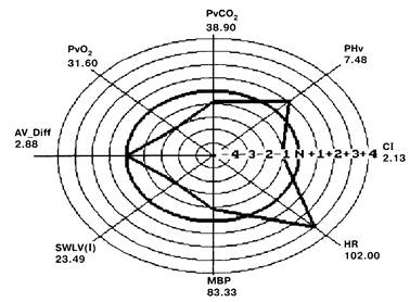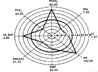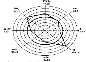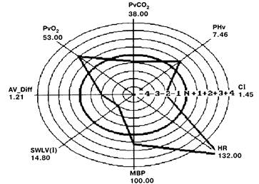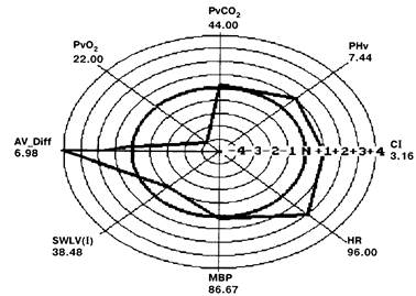 Несмотря на сниженную разовую и минутную производительность сердца, не характерную для кластера “метаболического дисбаланса”. уменьшение артерио-венозного градиента и повышение парциального давления кислорода в венозной крови более выражены, что и привело к уменьшению расстояния до этою патофизиологического профиля. Хотелось бы подчеркнуть, что на этом примере отчетливо видна неоднозначность выраженности каждого из профилей в конкретный момент времени. Так. в данном случае имеются признаки. характерные для профиля “легочно-сердечных нарушений” и для профиля “метаболических нарушений”. Только математический анализ позволяет определить, к которому из указанных паттернов ближе в данный момент патофизиологический профиль больного.