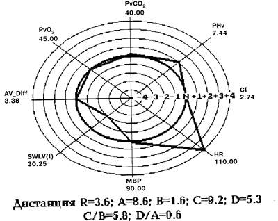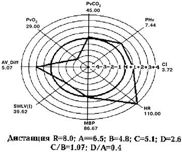Видно, что минимальная дистанция в этот период определяется до кластера “гиповолемических нарушений”, что и проявляется прежде всего в резком усилении экстракции кислорода тканями, увеличении артерио-венозного градиента, увеличении потребления кислорода до 200 мл/м2. Таким путем достигается компенсация сниженного уровня транспортного агента — гемоглобина. Необходимо подчеркнуть. что в этот период у пострадавшей выражены признаки синдрома системной воспалительной реакции за счет развития пневмонии. а микробиологические исследования крови на стерильность роста микрофлоры не выявили. На рис. 5.18 представлен патофизиологический профиль этой пострадавшей на следующий день после восполнения кровопотери. Показатели, необходимые для его расчета. были получены в ходе повторных микробиологических исследований. Как следует из представленного графика, дистанция до профиля “метаболических нарушений” становится минимальной, а отношение С/В достигает 5.8. В этот же период были получены положительные результаты микробиологических исследований крови — в посевах обнаружен St. epidermidis.