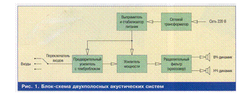 Типовая блок-схема двухполосных двухкомпонент-ных акустических систем показана на рис. 1. Для упрощения на ней изображен только один звуковой канал, второй выглядит аналогично (сетевой трансформатор и стабилизатор питания для обоих каналов общие). В акустических системах не используют импульсных блоков питания, создающих сильные помехи, а применяют традиционные силовые трансформаторы, выпрямители и компенсационные стабилизаторы. Если учесть КПД такого стабилизатора и усилителя мощности, можно смело сказать, что выходная мощность активных акустических систем не может превышать 50% мощности, потребляемой от сети.