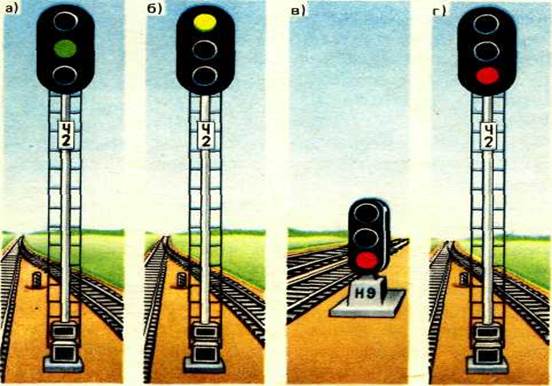 один зеленый огонь — "Разрешается поезду отправиться со станции и следовать с установленной скоростью; впереди свободны два или более блок-участка" (рис. 2.6, а);