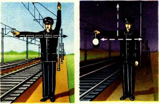 днем — повторными движениями правой руки перед собой но горизонтальной линии при поднятой вертикально левой руке;