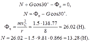 | Спроецируем силы на ось главной нормали к траектории движения , направленную от С к О. Согласно принципу Даламбера, сумма проекций должна быть равна нулю: