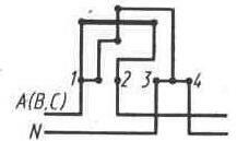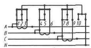 Трехфазные счетчики применяются в электроустановках, где используется трехфазный ток, а также на вводе установок, где используется однофазный ток, но подводятся три фазы, например, в жилых домах и учреждениях. На рис.2 показана схема счетчика, предназначенного для включения с трансформаторами тока в четырехпроводную сеть. Как видно из схемы, токовые обмотки счетчика присоединяются ко вторичным обмоткам трансформатора тока через зажимы 1 и 3, 4 и 6, 7 и 9. Зажимы 1, 4, 7 присоединяются к фазам и к первым выводам обмоток напряжения, вторые выводы которых соединены вместе и присоединяются к нулевому проводу.