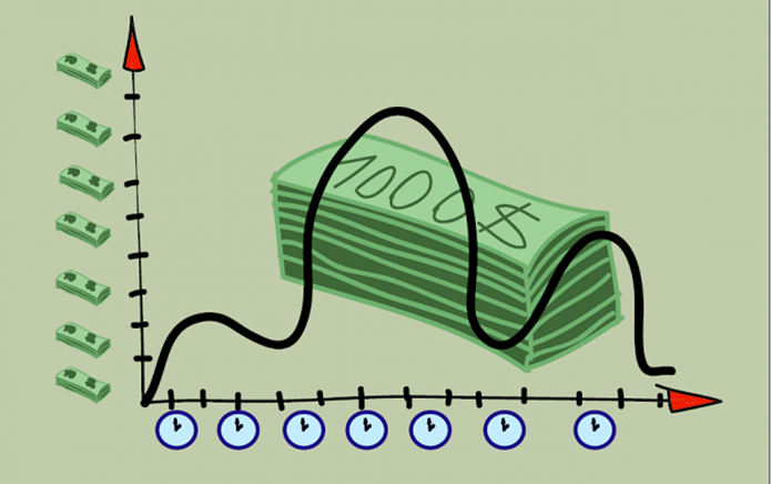 Поверните голову назад и внимательно посмотрите в прошлое. Отмотайте время хотя бы на три года назад. Начертите на бумаге оси координат (деньги — время). На оси времени начертите 36 отрезков, соответствующих месяцам. Поставьте ручку на нулевую точку и погрузитесь в воспоминания. Не отрывая ручку от бумаги, следуя по линии времени, нарисуйте кривую роста ваших денег. Месяц за месяцем вспоминайте факты. Рисуйте взлеты и рисуйте падения, вспоминайте, почему кривая на этом участке выглядит именно так.