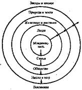 [Надписи (сверху — вниз): Звезды и космос, Природа и земля, Животные и растения, Люди, Младенец — мать, Семья, Общество, Нация и мир, Вселенная.]