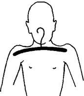 Второй способ, с помощью которого мы можем видеть подвешенность физически, это осанка или положение верхней части тела. Существует несколько общих состояний подвешенности; одним из наиболее часто встречающихся является то, что я назвал типом вешалки. Он практически единственный для мужчин. Плечи подняты и напоминают квадрат, голова и шея наклонены вперед. Руки болтаются, незакрепленные в суставах, грудь также приподнята. Я назвал это положение вешалкой, потому что кажется, будто тело висит на невидимой вешалке (рис. 27).