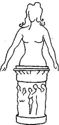 Существует также другой путь, с помощью которого женщина становится подвешенной к сексуальной морали, это помещение на пьедестал. Я описал подобный случай в книге «Депрессия и тело». Вознесение на пьедестал убирает у человека почву из-под ног, так же как и в состоянии подвешенности. В случае, с которым мне пришлось встретиться на практике, тело пациентки от таза вниз выглядело, как пьедестал. Оно было жестким и неподвижным и, казалось, служило только как основание для верхней части (рис. 29).