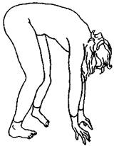 Несколько лет назад в Эсалене, во время одной из моих полугодовых поездок для обучения биоэнергетике, я сблизился с одной молодой женщиной, которая вела уроки тай чи для местных жителей и гостей. Она сказала мне, что, хотя она применяла биоэнергетические упражнения, ей никогда не удавалось добиться вибрации в ногах. Она видела что вибрация появлялась в ногах у людей, участвующих в моих семинарах, и удивлялась, почему вибрации не было у нее. Я могу добавить, что эта молодая женщина до того, как стать учителем тай чи была танцовщицей. Когда я предложил поработать с ней она с радостью согласилась. Я использовал три упражнения. Первым была позиция арки, описанная в главе 11, что должно было помочь выпрямить тело и углубить дыхание. Некоторые люди реагировали на напряжение в этом упражнении легкой вибрацией но только не она. Ее ноги были слишком зажаты и слишком напряжены. Ей требовалось более сильное напряжение, чтобы сломить эту жесткость и чтобы появилось дрожание в ногах. Это упражнение заключалось в стоянии на одной ноге с согнутым коленом и в сохранении равновесия, держась одной рукой за стул. Масса всего тела была перенесена на согнутую ногу. Ей нужно было держаться в этом положении так долго, сколько она могла, а затем, когда боль становилась невыносимой, упасть на одеяло, положенное на полу перед ней. Она проделывала это упражнение дважды, на каждой ноге попеременно. Третье упражнение включало наклон вперед со слегка согнутыми коленями и касание пола кончиками пальцев (рис. 31).