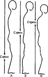 На фигуре справа (В) показана совершенно другая поза. Верх спины согнут, как будто человек постоянно должен нести тяжелую ношу. Колени согнуты, но это в противовес выдвинутому вперед тазу. В этой позе спина целиком сплющивается под воздействием стресса, который щадит пояснично-крестцовую область. Это типичная поза мазохистского характера, который больше подчиняется давлению, чем пытается выстоять под ним. Сохранение этой позы позволяет пожертвовать личностью в целом ради спины. Но это перестает действовать, если человек будет делать решительные попытки подняться и сопротивляться. Когда это происходит, как например в курсе терапии, то ощущается напряжение в нижней части спины. Я всегда предупреждаю таких пациентов, что это случится. Однако проблема никогда не стоит остро, потому что пациент уже занимается биоэнергетическими упражнениями, рассчитанными на высвобождение таза и уменьшение напряжения в пояснично-крестцовой области.