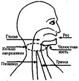 [Надписи (сверху — вниз, слева — направо): Глотка, Рот, Кольцо напряжения, Челюстная кость, Пищевод, Трахея.]